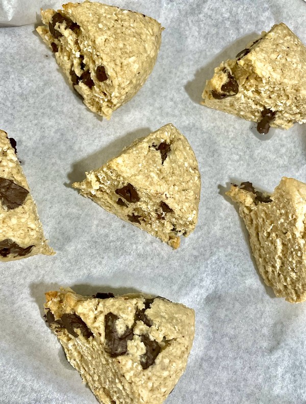 재료가 준비됐으면 퀵 오트밀 가루, 아몬드 가루, 베이킹파우더를 모두 그릇에 넣고 섞는다. 여기에 두유를 넣고 한 덩이로 뭉친다. 그 후 원하는 모양으로 만들어 랩으로 감싸 냉동실에 30분 정도 굳혀준다. 30분 뒤 원하는 크기로 잘라 종이 포일을 깔고 반죽을 올린다. 170도로 예열한 오븐에 15분에서 18분 정도 굽는다. 오븐마다 사양이 다르므로 반죽의 상태를 지켜보면서 구워야 한다. 반죽이 다 구워지면 스콘이 완성된다. 스콘을 하나씩 개별 포장해 냉동실에 얼려두는 것을 추천한다. 얼린 스콘을 냉동실에서 꺼내 에어프라이어(Air-fryer)에 150도로 8분에서 10분 정도 구우면 아침에 간편하게 먹기 딱 좋다.